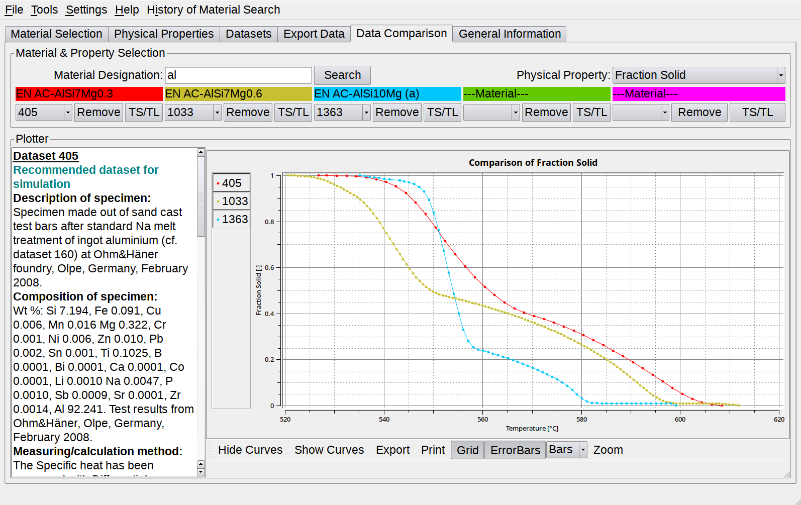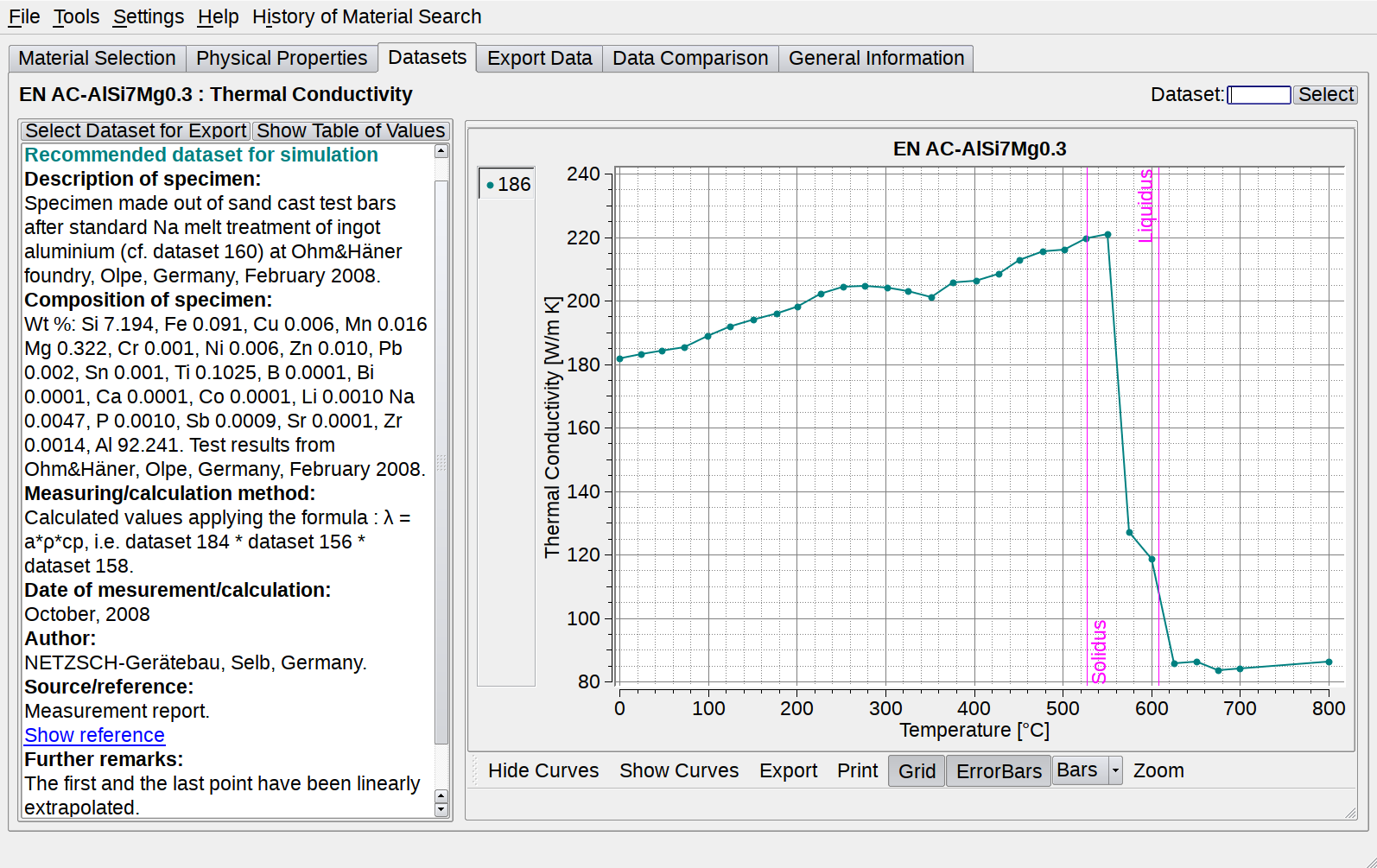 The casting material database can display detailed information on a specific data record or property together with information on the source of the data.